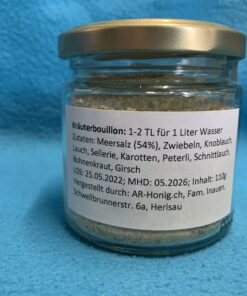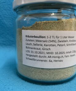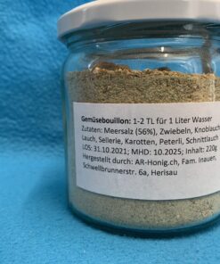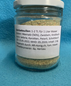 Zutaten: Meersalz (56%), Zwiebeln, Knoblauch, Lauch, Sellerie, Karotten, Peterli, Schnittlauch